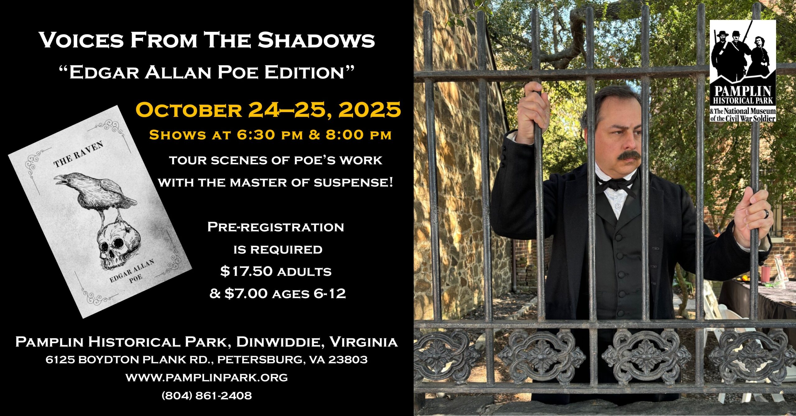 Tours will be accompanied by sights and sounds that heighten the senses while breaking the silence of the night. Inspired by the works of Edgar Allan Poe, the naturally haunting atmosphere of Pamplin Historical Park gives visitors a rare opportunity to experience the Park and battlefield after dark. “Words have no power to impress the mind without the exquisite horror of their reality.” – Edgar Allen Poe.